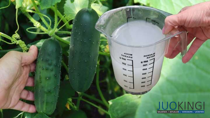 5. Agurkus apipurkškite ir palaistykite išrūgų tirpalu: 1 litras išrūgų 5 litrams vandens.