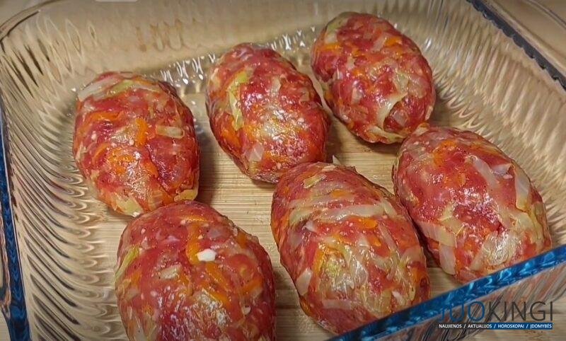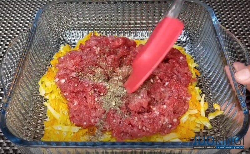 Susmulkinkite kopūstą, sudėkite jį į morkų ir svogūnų mišinį ir išmaišykite. Kopūstų mišinį pagardinkite druska ir sudėkite į gilų dubenį. Į kopūstų mišinį sudėkite maltą mėsą ir prieskonius ir išmaišykite.