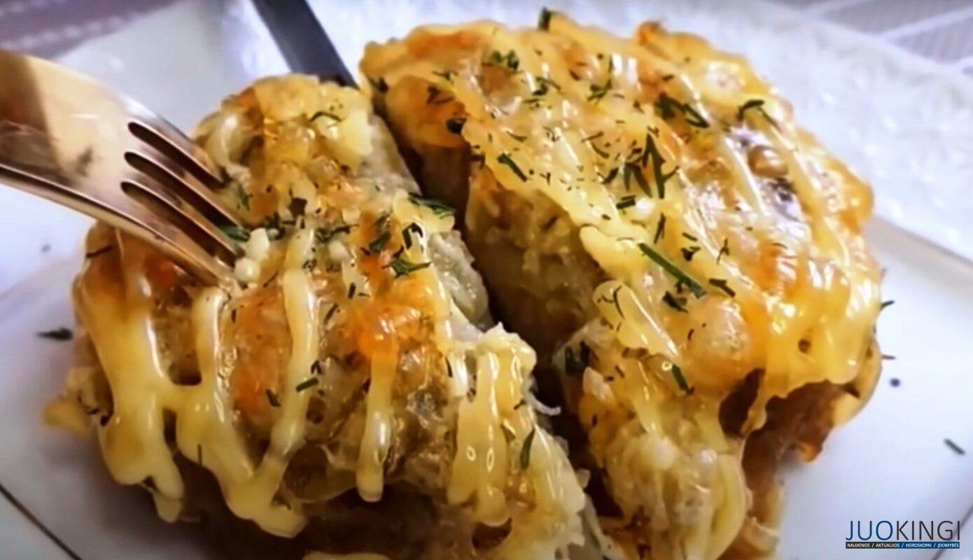 Šis gražus, aromatingas ir gardus patiekalas puikiai dera su įvairiais garnyrais. Jei norite, pridėkite grybų griežinėlių ir turėsite naują šventinį užkandį.