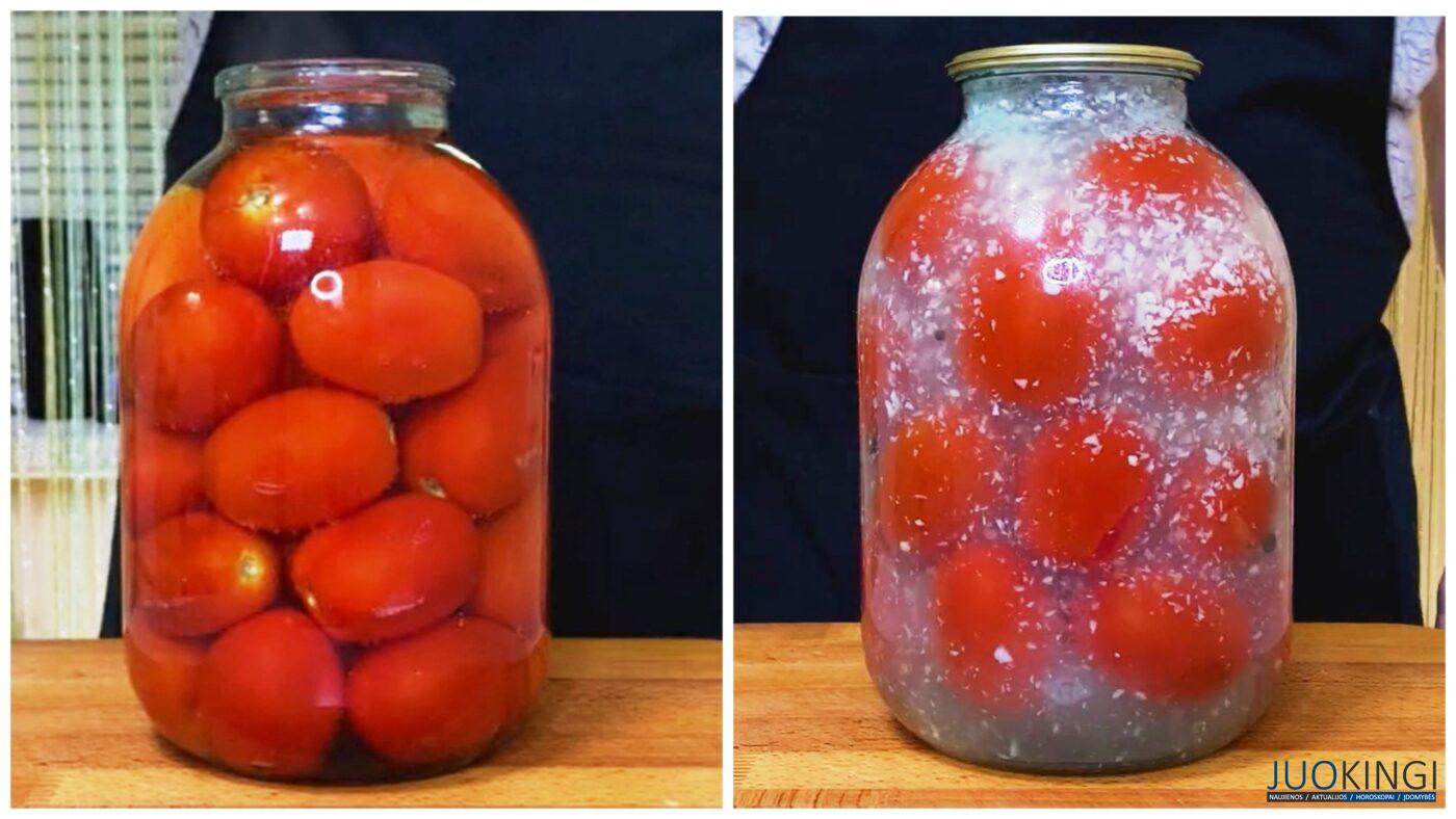 . Į stiklainį prie pomidorų sudėkite pipirų žirnelius ir supilkite marinatą, užsukite dangtelius