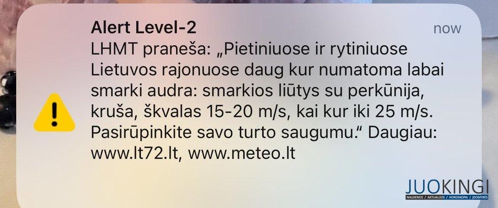 Kaip praneša Lietuvos hidrometeorologijos tarnyba, pietrytinėje šalies dalyje prognozuojama viena stipriausių audrų šį sezoną. Didžiausia rizika išlieka Alytaus, Vilniaus ir Utenos apskrityse.
