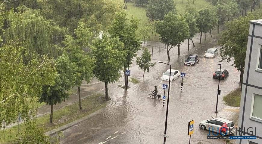 Gyventojai iš Alytaus dalijasi vaizdais, kuriuose matyti apsemti keliai, sustojęs eismas ir intensyvios liūtys, kurių metu kai kuriose vietovėse per keliolika minučių iškrito mėnesio norma kritulių.