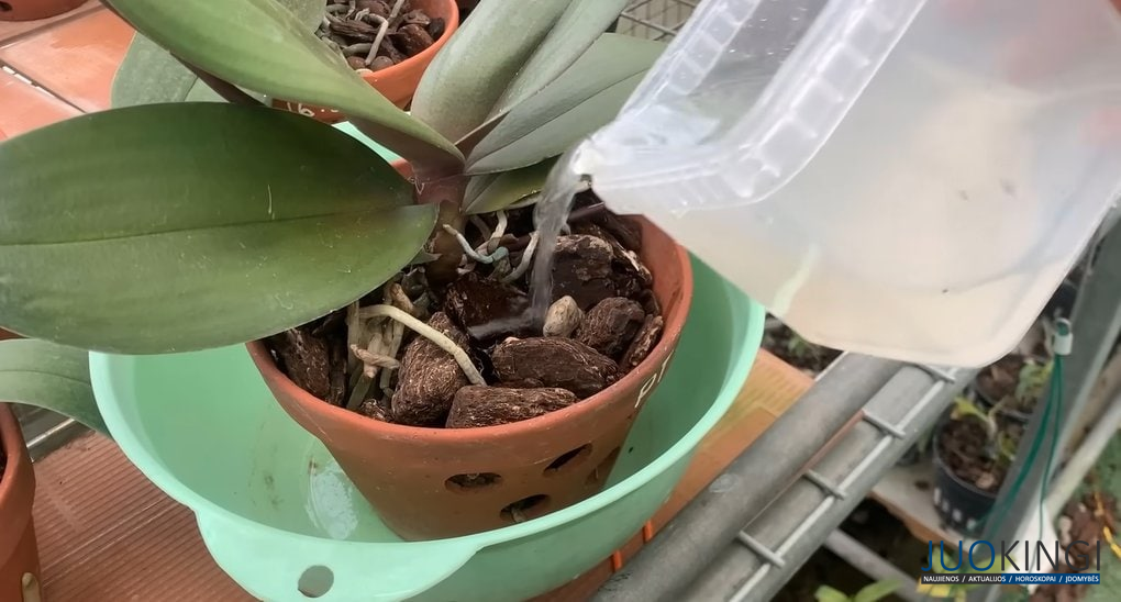 Organiniu tirpalu laistykite orchidėją prie šaknų kartą per tris savaites.