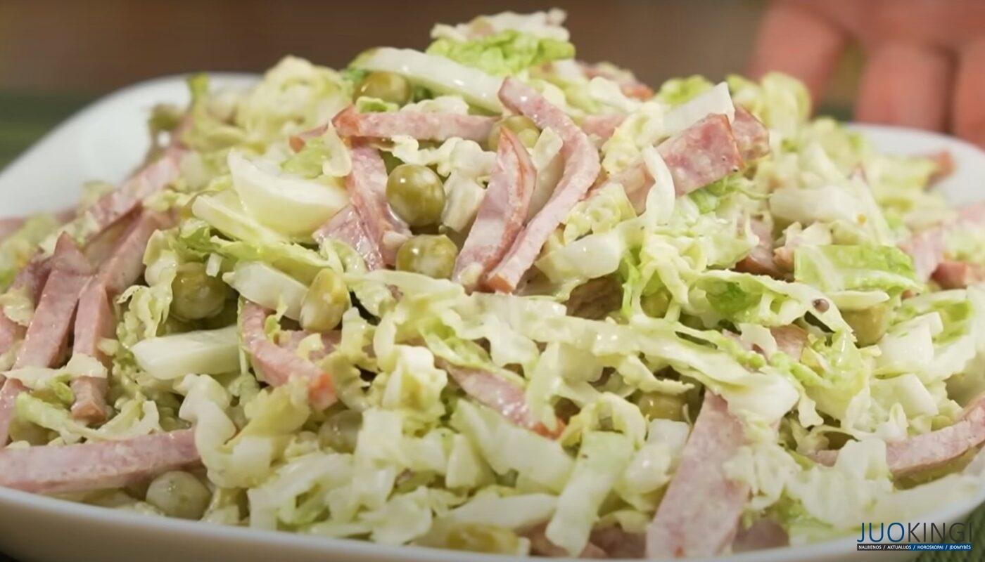 Šinkuojame smulkiai Pekino kopūstą, jį galima pakeisti baltagūžiu kopūstu. Dešrą supjaustykite plonais griežinėliais, sumaišykite su kopūstais ir žirneliais.