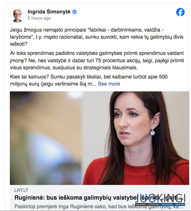 „Valstybė jau dabar turi 75 proc. akcijų, gali priimti visus strateginius sprendimus. Kam dar ieškoti galimybių, kurių realiai nereikia? Kalbame apie 700–800 mln. eurų, kurių biudžete nėra. Jei tie pinigai atsirastų, juos tikrai išmintingiau būtų skirti gynybai“, – „Facebook“ rašė I. Šimonytė.