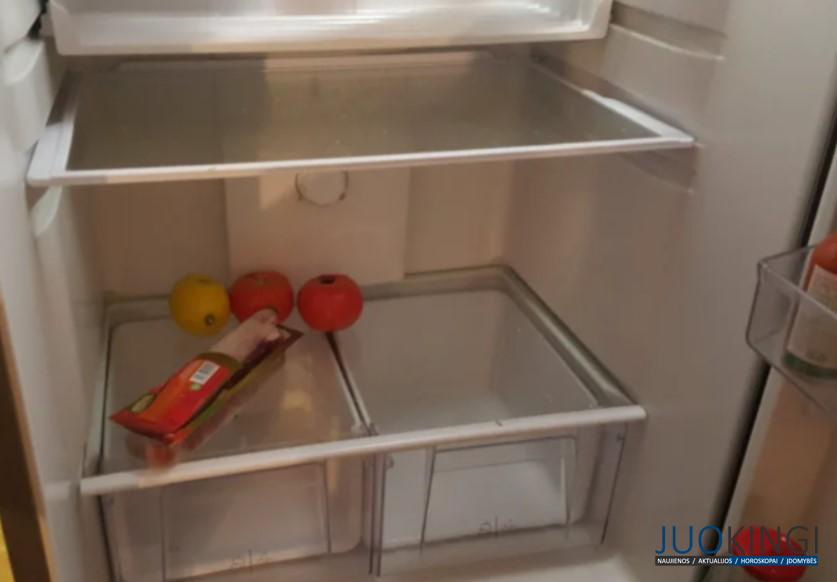Šaldytuve buvo nedidelis gabalėlis citrinos, jau rudos spalvos, gabalėlis sūrio, sviesto ir duonos maišelyje. Dar kažkas buvo ant durelių.