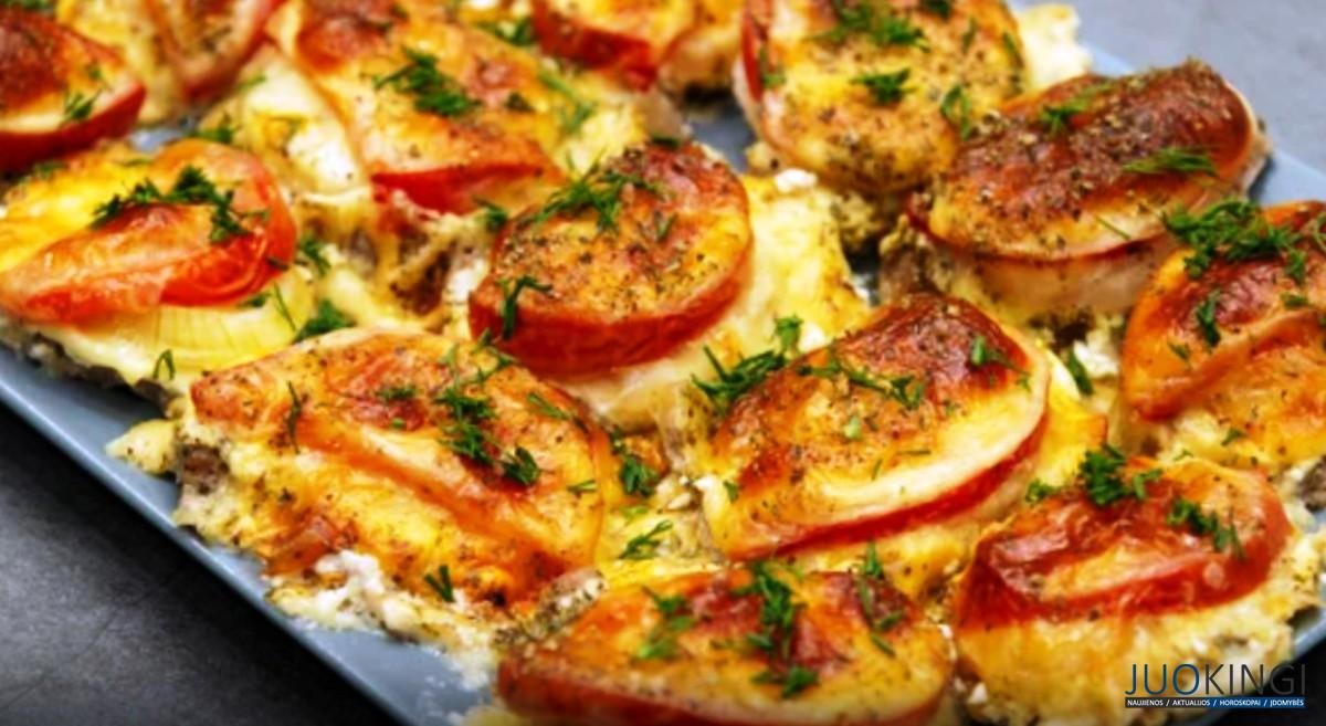 . Ant viršaus plonais pusžiedžiais išdėliokite svogūnus, pomidorų apskritimus