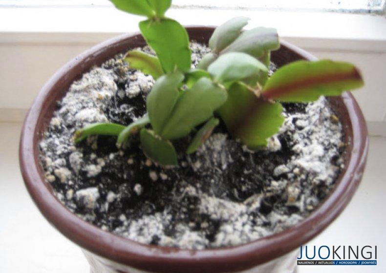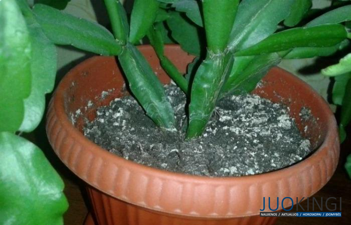 - Vanduo, kuriuo laistome kambarinius augalus, yra per kietas, ir jam išgaravus dėl sauso oro, pradeda formuotis balta danga;