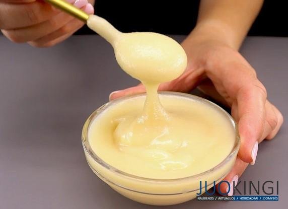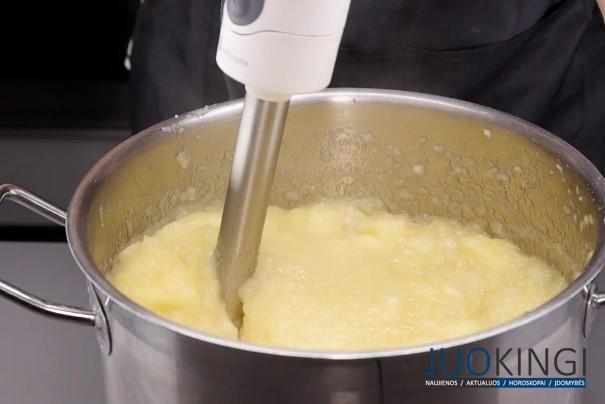 Plakite mišinį elektriniu trintuvu iki tyrės konsistencijos, tada supilkite kondensuotą pieną ir išmaišykite.