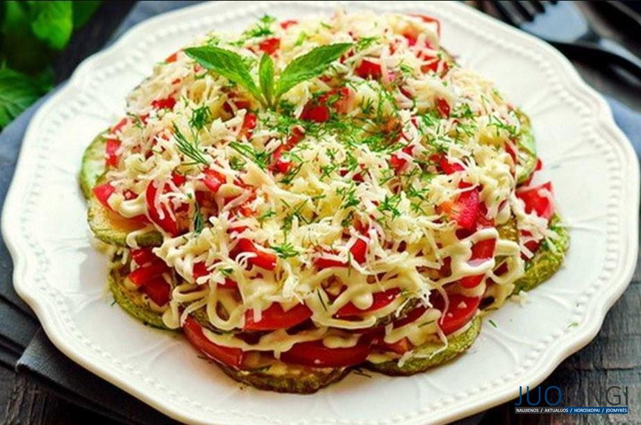 Plokščiame lėkštėje išdėliokite cukinijų sluoksnį, padarykite majonezo tinklelį ir pabarstykite žalumynais.