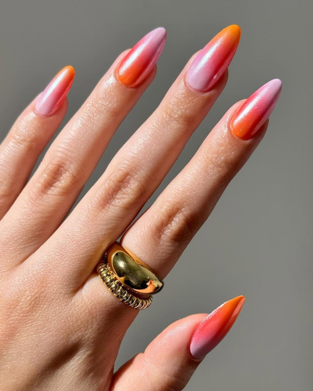 Jei negalite pasirinkti vieno atspalvio manikiūrui, rinkitės ombre techniką. Sklandžiai pereinant iš vienos spalvos į kitą, šis dizainas sukuria įdomų ir įvairiapusį efektą. Neutralus atspalvis kartu su ryškia spalva pritrauks dėmesį ir sustiprins energingą manikiūro efektą.