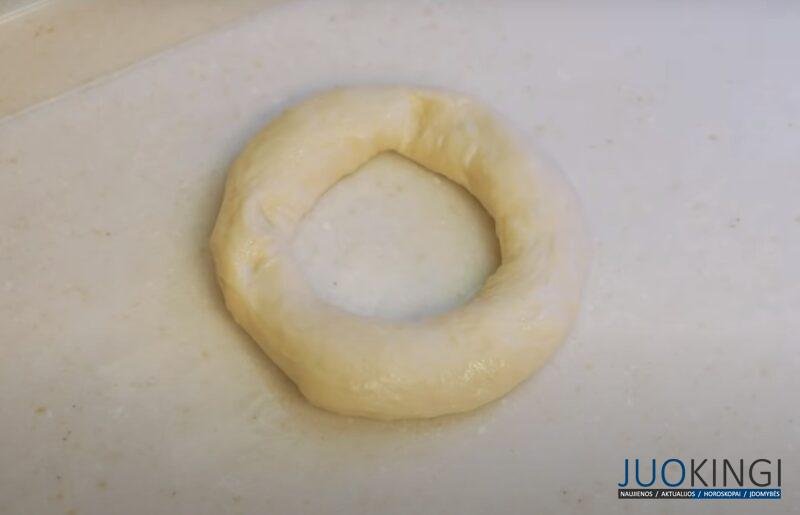 Dar kartą sutepkite stalviršį riebalais ir padalinkite tešlą į mažus rutuliukus. Pirštu padarykite skylutę kiekvieno rutuliuko centre ir šiek tiek jį ištempkite.