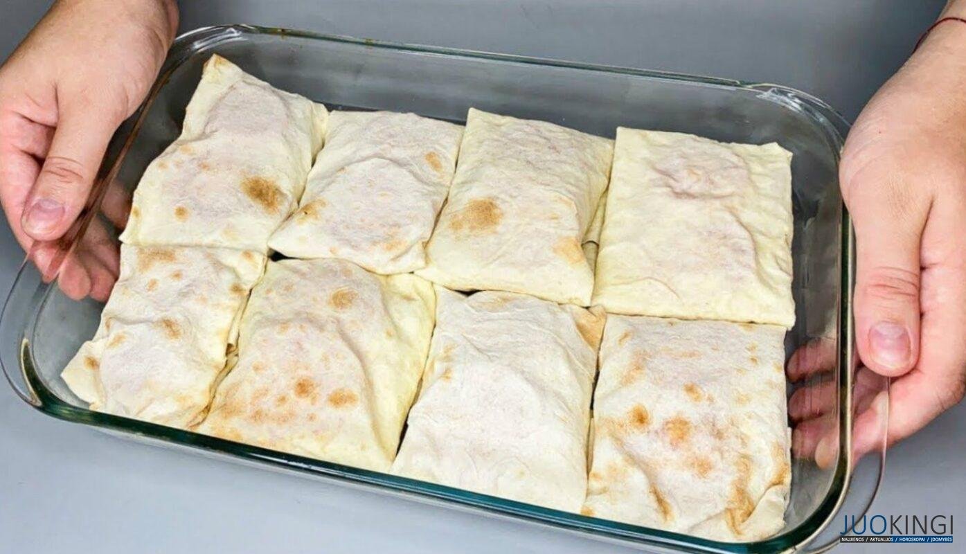 Supjaustome lavašą tokio dydžio kvadratėliais, kad kiekvieną žuvies gabalėlį būtų galima suvynioti į voką