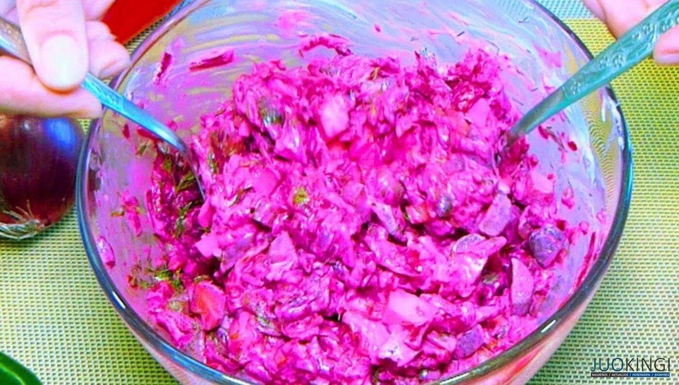 . Salotinėje sumaišykite burokėlius su kiaušiniais, sūriu, bulvėmis ir marinuotais agurkais. Raudonąjį svogūną supjaustykite kubeliais, petražoles susmulkinkite