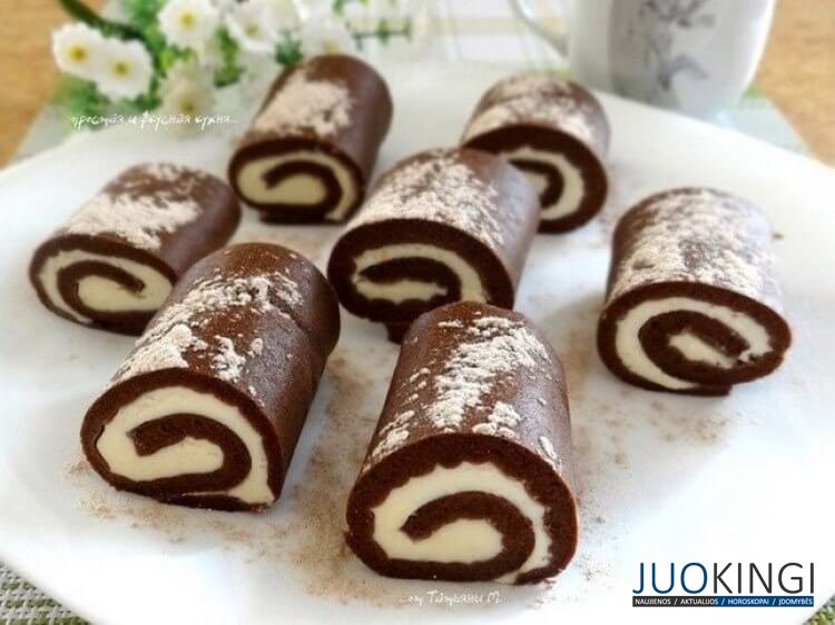 - Įdarą dėkite ant paplotėlių ir susukite juos į ritinėlius. Ritinėlius 1 valandai padėkite į šaldytuvą.