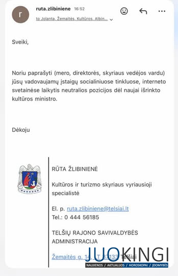 „Noriu paparašyti (mero, direktorės, skyriaus vedėjos vardu) jūsų vadovaujamų įstaigų socialiniuose tinkluose, interneto svetainėse laikytis neutralios pozicijos dėl naujai išrinkto kultūros ministro“, – įstaigoms parašė Telšių Kultūros ir turizmo skyriaus vyriausioji specialistė Rūta Žlibinienė.