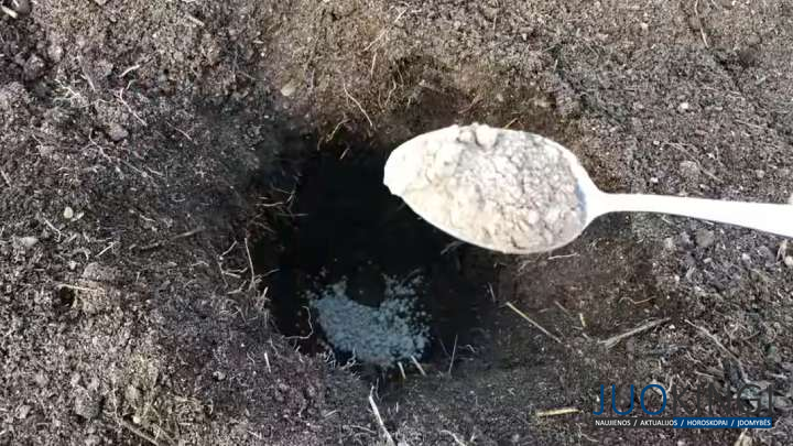 Įdėkite 1 desertinį šaukštą borofoskos, 1 valg. šaukštą. apačioje. l. pelenai, žiupsnelis humuso. Viską sumaišykite su dirvožemiu.