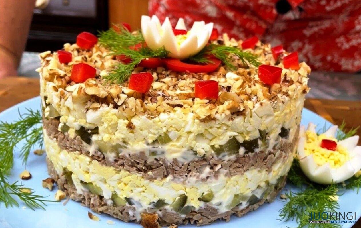 . Panašiai išdėliokite sluoksnį mėsos likučių, tada agurkų su česnaku ir kiaušinių. Graikinius riešutus susmulkinkite stambiais trupiniais ir apibarstykite jais salotų viršų