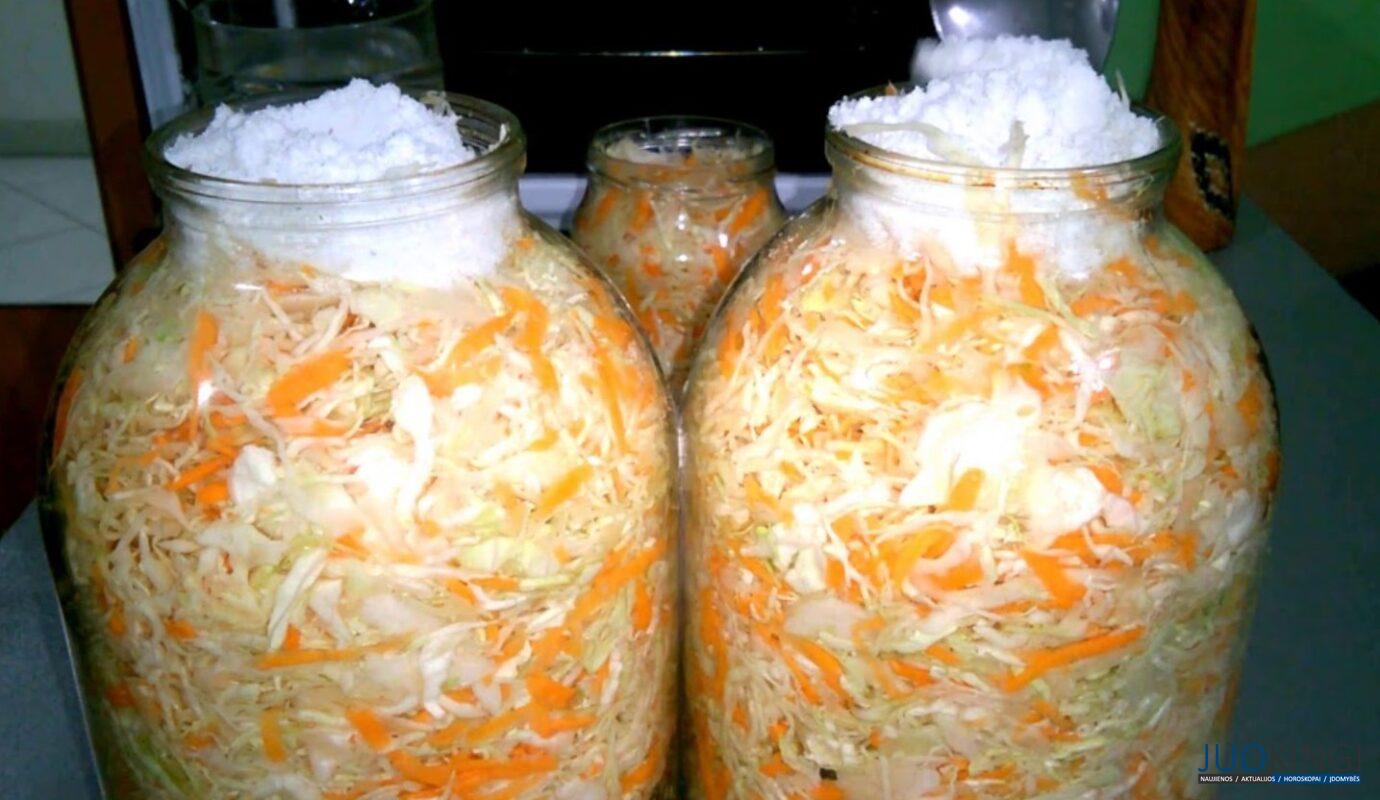 Kopūstai susmulkinami, sumaišomi su tarkuotomis morkomis, išminkomi rankomis, pasūdoma, supilami visi prieskoniai.