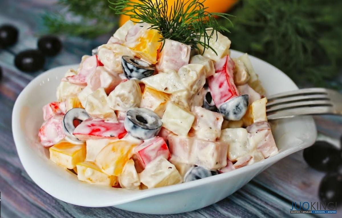 Visi produktai supjaustomi gabaliukais pagal skonį, sumaišomi ir užpilami majonezu, druska ir pipirais pagal skonį.