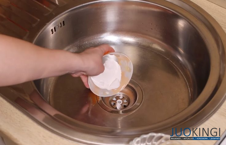- Į kanalizaciją įpilkite pusę stiklinės kepimo sodos ir tokį patį kiekį druskos. Įmaišykite juos tiesiai į slyvą.