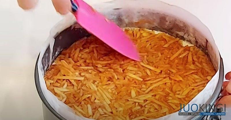 Užpildykite sausu mišiniu, tada sudėkite obuolių įdarą ir sausą mišinį.