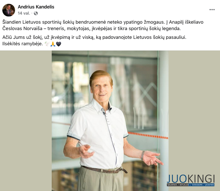 „Šiandien Lietuvos sportinių šokių bendruomenė neteko ypatingo žmogaus. Į Anapilį iškeliavo Česlovas Norvaiša – treneris, mokytojas, įkvėpėjas ir tikra sportinių šokių legenda. Ačiū Jums už šokį, už įkvėpimą ir už viską, ką padovanojote Lietuvos šokių pasauliui. Ilsėkitės ramybėje“, – rašė A. Kandelis.