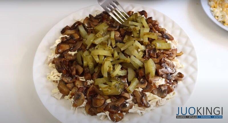 Išvirtą vištienos filė suplėšykite sruogomis, taip suformuodami pirmąjį salotų sluoksnį. Mėsą uždenkite majonezo tinkleliu. Ant vištienos sluoksnio uždėkite grybų ir svogūnų sluoksnį.