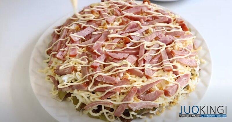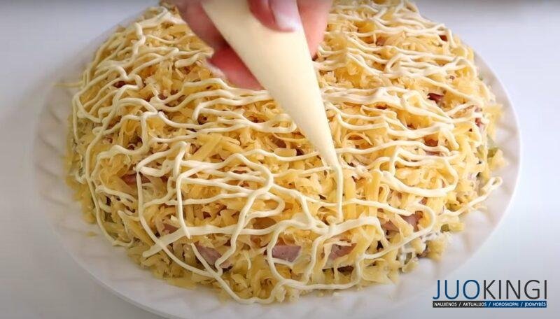Rūkytą dešrą supjaustykite juostelėmis, panašiai kaip agurkus, ir suformuokite kitą sluoksnį. Sūrį sutarkuokite stambia tarka.