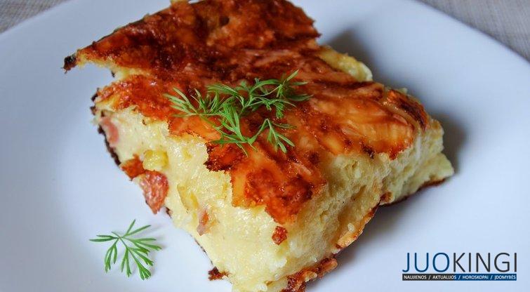 Reikės: 9 vidutinio dydžio bulvių (apie 1,3kg); 200g fermentinio sūrio; 200g karštai rūkytos šoninės; 1 svogūno; 0,5 l pieno; 4 kiaušinių; žiupsnelio malto muskato; druskos.