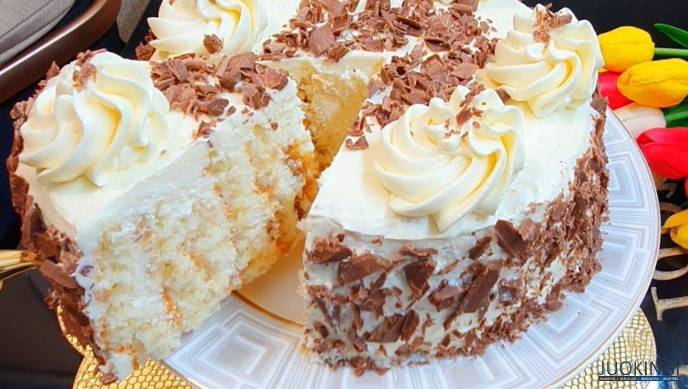 Šonus ir viršų aptepkite kremu. Papuoškite tortą šokolado drožlėmis, jei norite, iš kremo padarykite rožes.