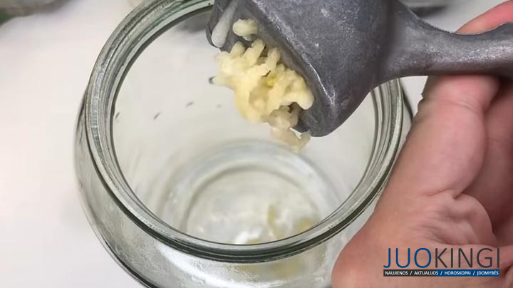 Per presą išspauskite 3 dideles česnako skilteles. Supilkite litrą karšto vandens. Uždenkite ir palikite 24 valandoms.