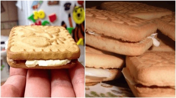 Jie improvizuotą pyragą gaminą daro labai paprastai: paimate du sausainius, sutepate juos sviestu ir sudedate.