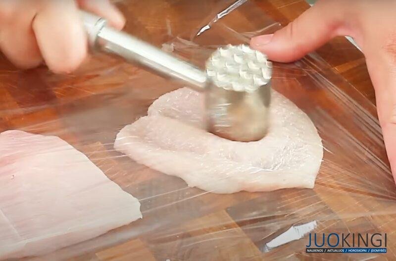 Filė perpjaukite išilgai, kiekvieną kepsnį padalinkite per pusę, uždenkite maistine plėvele ir išmuškite.