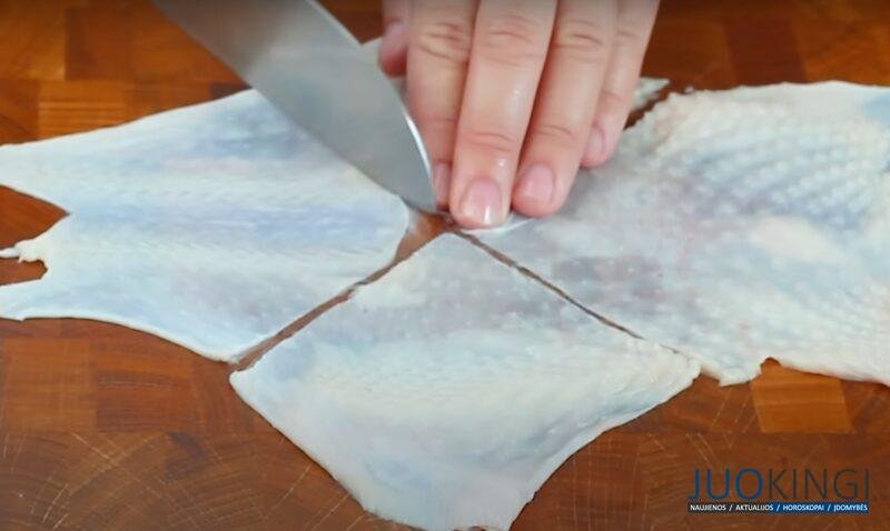 Vištienos odelę ištempiame ir taip pat padalijame į 4 lygias dalis.