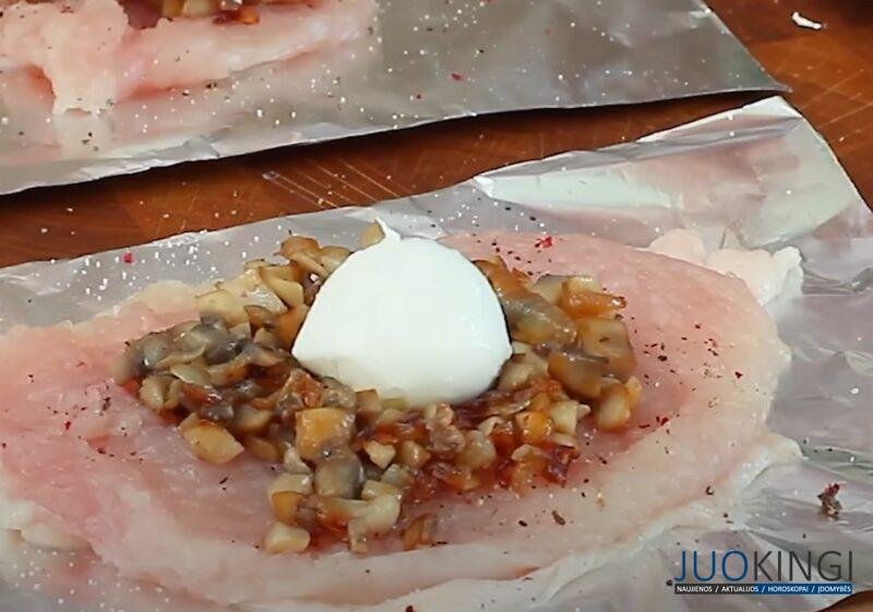 Foliją padalinkite į 4 kvadratus, ant kiekvieno uždėkite po vištienos odos gabalėlius. Ant odos uždėkite išmuštus gabalėlius, o ant mėsos gabalėlių uždėkite grybų ir svogūnų įdaro.