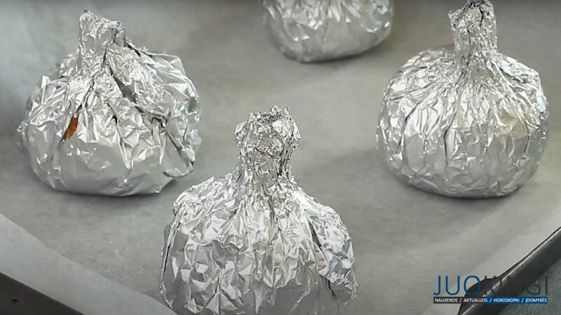 Rutuliukus suvyniojame į foliją ir dedame ant kepimo skardos, išklotos kepimo popieriumi.