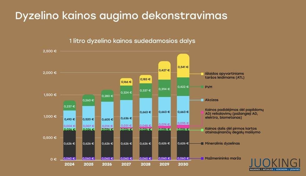 akcizai. 2025 metais akcizo dalis dyzelino kainoje sudaro 0,52 euro – akcizai kils dar kelerius metus iš eilės, kol 2028 metais pasieks 0,66 euro už litrą ribą.